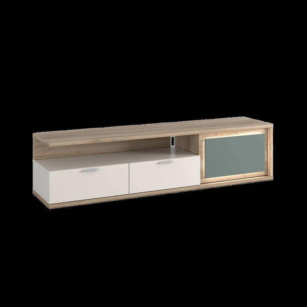 A Base de TV ASOLA destaca-se pelo design contemporâneo e pela organização bem distribuída. O acabamento em carvalho confere um visual natural, enquanto a composição integra duas gavetas, um nicho aberto para equipamentos multimédia e uma porta para arrumação discreta. Os puxadores metálicos reforçam o toque moderno.