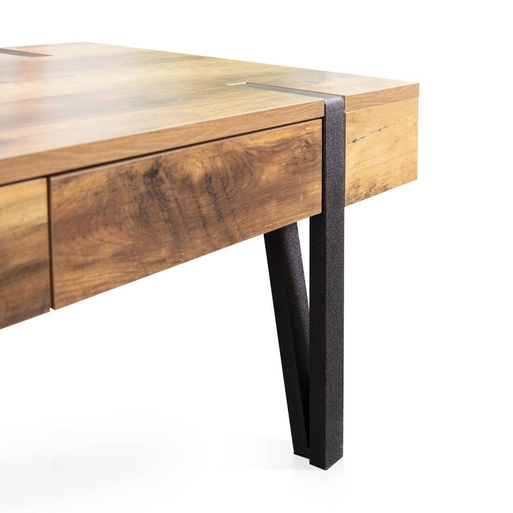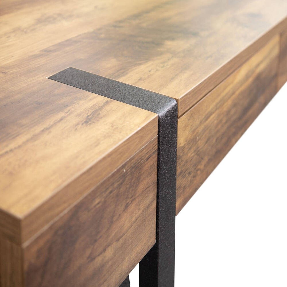 O tampo da mesa apresenta uma superfície generosa, perfeita para acomodar itens essenciais do dia a dia ou objetos decorativos. A peça inclui duas gavetas, ideais para armazenar pequenos objetos e manter o espaço organizado. A sua versatilidade permite que se adapte facilmente a uma variedade de estilos de decoração, desde ambientes modernos até espaços tradicionais.