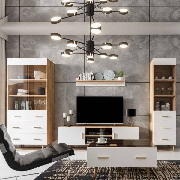 A Estante Brillo GM destaca-se pelo seu design moderno e funcional, disponível em duas combinações elegantes: branco com cinzento ou branco com faia. Com prateleiras abertas, vitrinas com vidro e compartimentos fechados, oferece uma solução prática para organizar livros, objetos decorativos e outros itens do dia a dia.