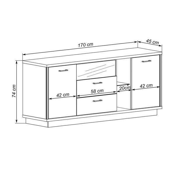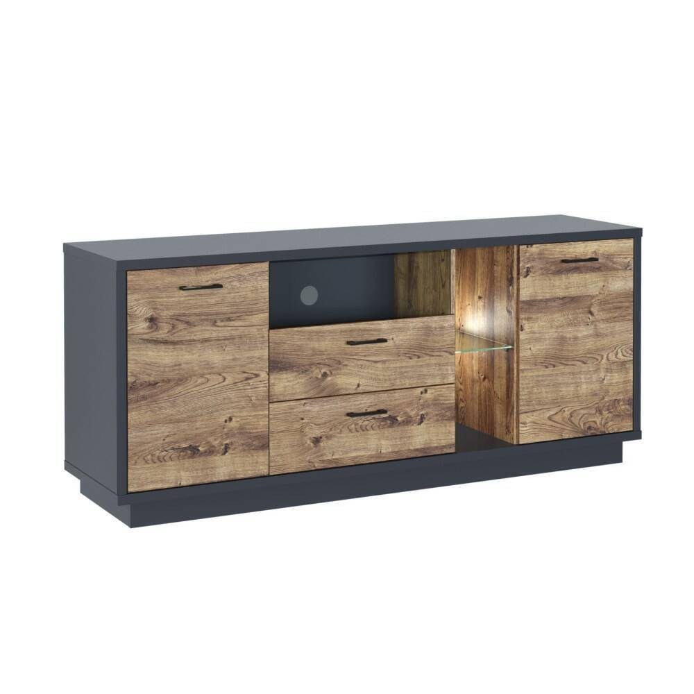Dispõe de duas portas e duas gavetas espaçosas, oferecendo amplo espaço para organizar dispositivos eletrónicos e acessórios. Inclui uma prateleira de vidro e iluminação LED integrada que valoriza o espaço, criando um ambiente acolhedor e contemporâneo.