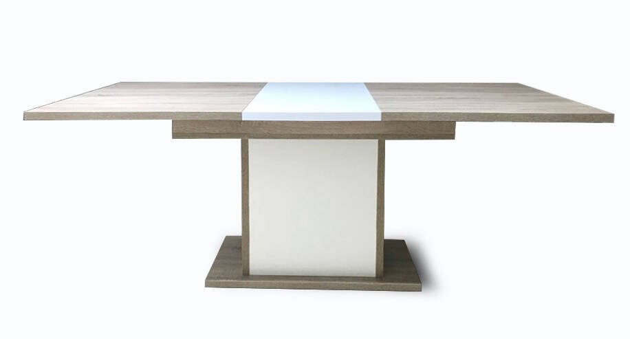 A mesa combina linhas retas com um design contemporâneo, destacando-se pelo tampo retangular com faixa branca central. A mistura entre madeira e branco acrescenta leveza visual e adapta-se facilmente a interiores modernos.