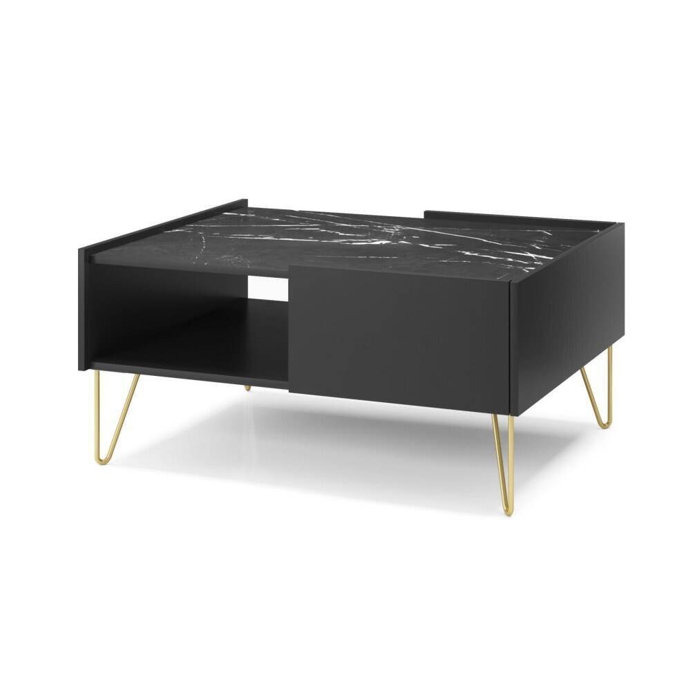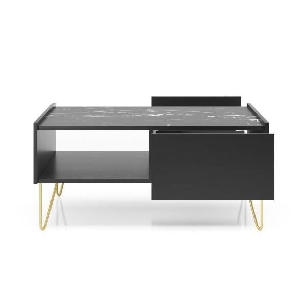 Os pés metálicos dourados acrescentam um detalhe de luxo ao conjunto, reforçando a estética moderna da peça. Uma mesa de centro com forte presença visual, pensada para ambientes que valorizam estilo e praticidade.