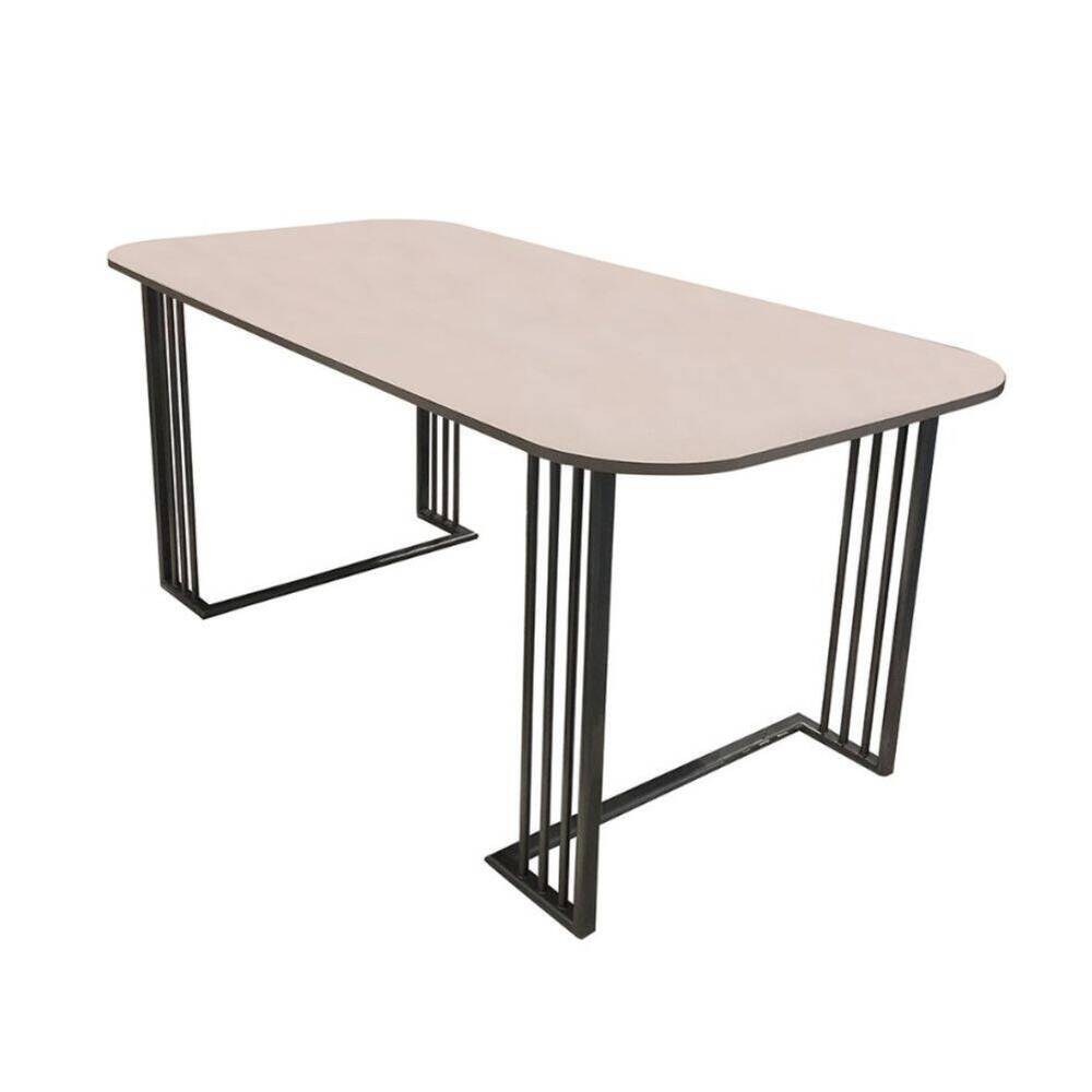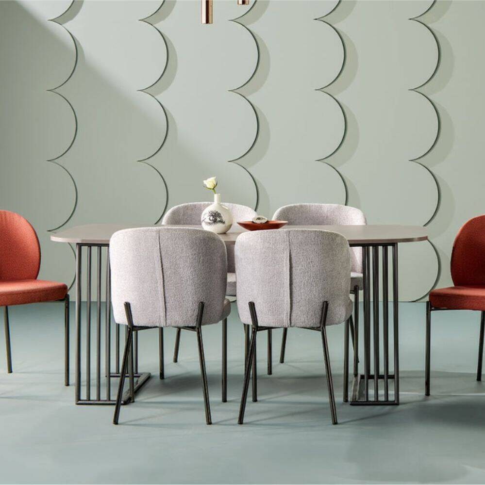 Com tampo retangular de cantos arredondados e uma estrutura metálica preta formada por barras verticais que funcionam como quatro pernas, a mesa de jantar LAVITA combina leveza visual, estabilidade e um design contemporâneo marcante para ambientes modernos.