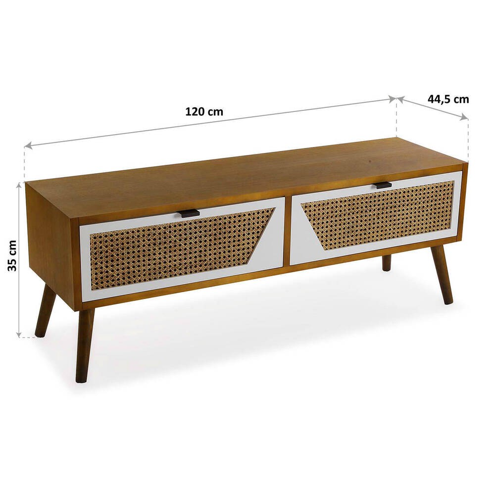 A Base de TV MARTINE combina madeira quente com frentes trançadas de inspiração retrô, criando um visual acolhedor e distintivo. Com duas gavetas frontais, oferece arrumação prática e um toque decorativo marcante.