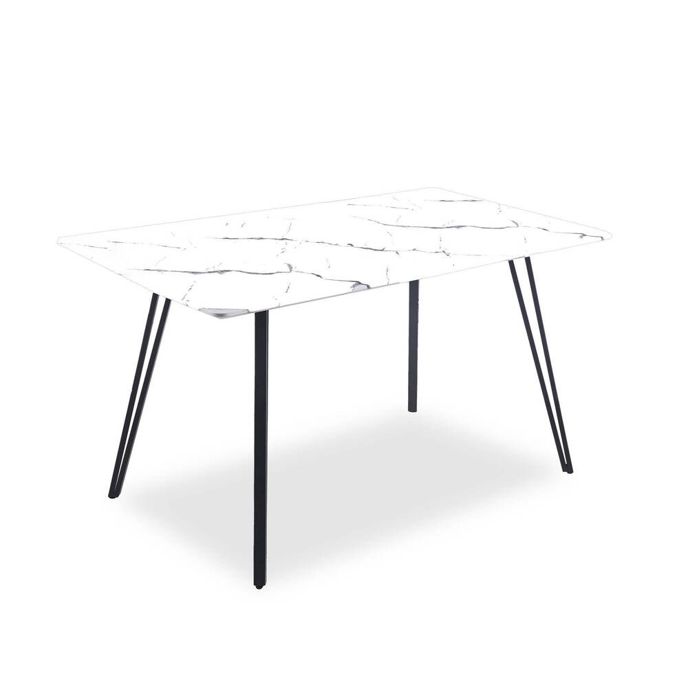 Esta mesa de jantar destaca-se pelo tampo branco com padrão estilo mármore, que traz um toque sofisticado e único ao ambiente. A sua cor clara diferencia-se das mesas tradicionais, conferindo leveza e modernidade ao espaço.