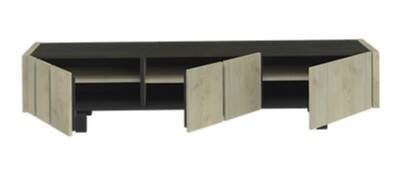 A Base de TV RUSH destaca-se pelo design simples e funcional, marcado pelas linhas retas e pelos pés pretos curtos, que acrescentam leveza e estabilidade ao conjunto. A estrutura integra três portas, garantindo arrumação generosa para equipamentos multimédia, acessórios e objetos do quotidiano, mantendo tudo organizado de forma discreta.