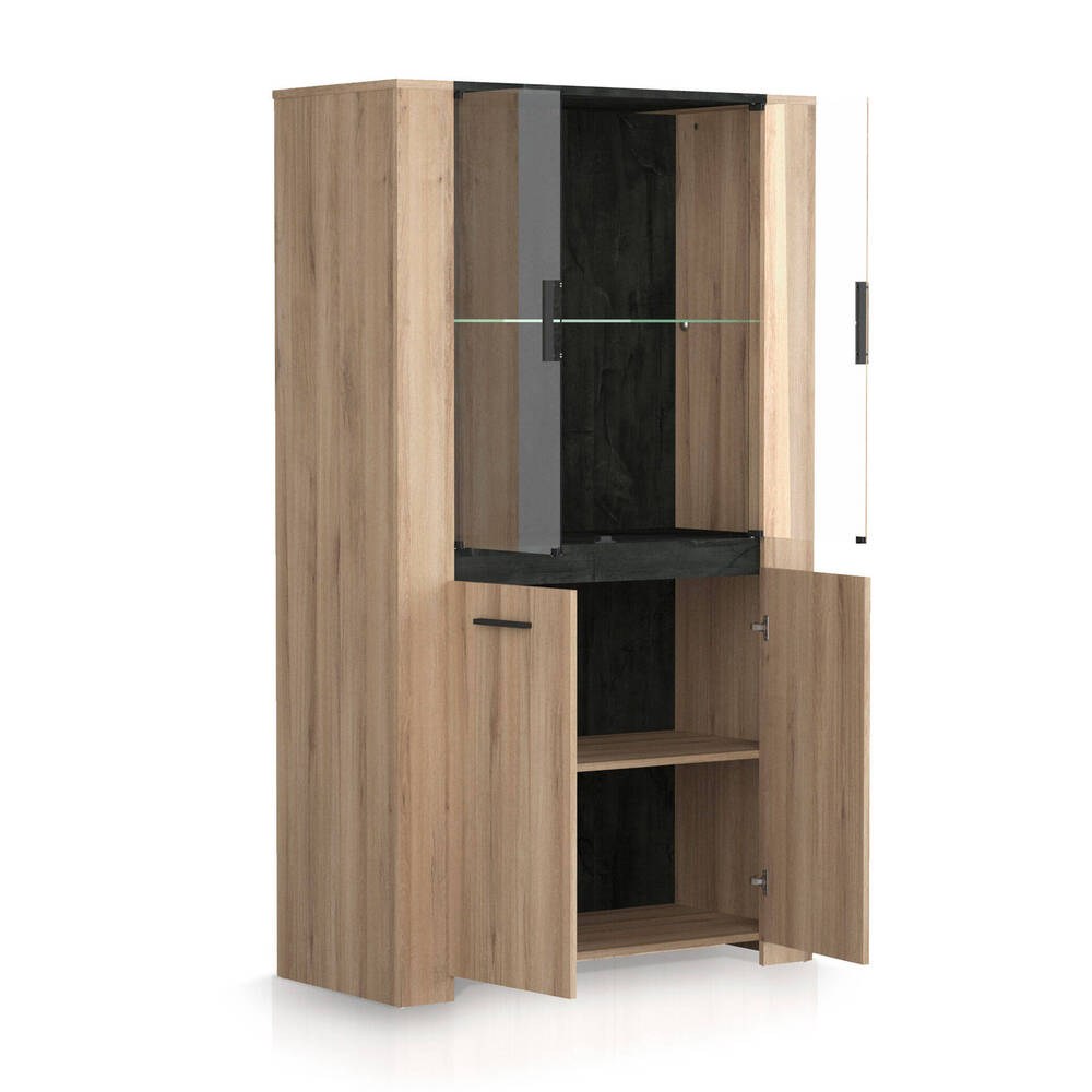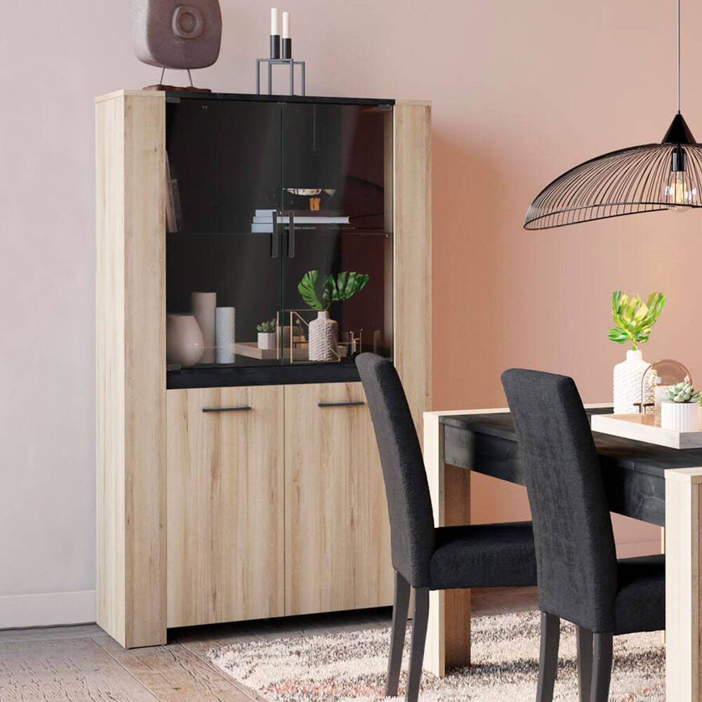 Com um acabamento que combina tons claros e escuros, esta vitrine oferece versatilidade e elegância, adaptando-se facilmente a vários estilos de decoração. Ideal para otimizar o espaço em salas de estar, corredores ou zonas de jantar, apresenta-se como uma solução prática e sofisticada, sem comprometer o estilo do ambiente.