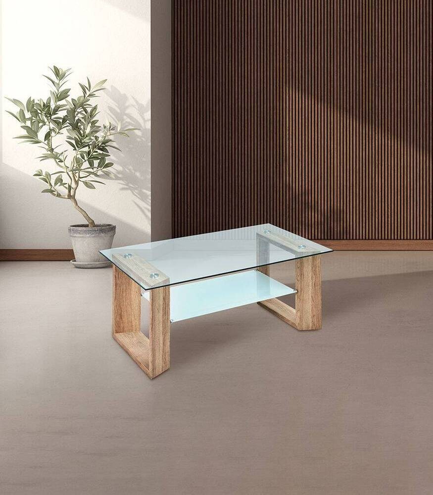 A Mesa de Centro TARA apresenta tampo em vidro transparente e prateleira inferior em vidro fosco, sustentados por uma estrutura em madeira com suportes retangulares e fixações metálicas discretas. A combinação entre transparência e acabamento fosco cria um efeito visual leve, enquanto a prateleira acrescenta funcionalidade para organização.