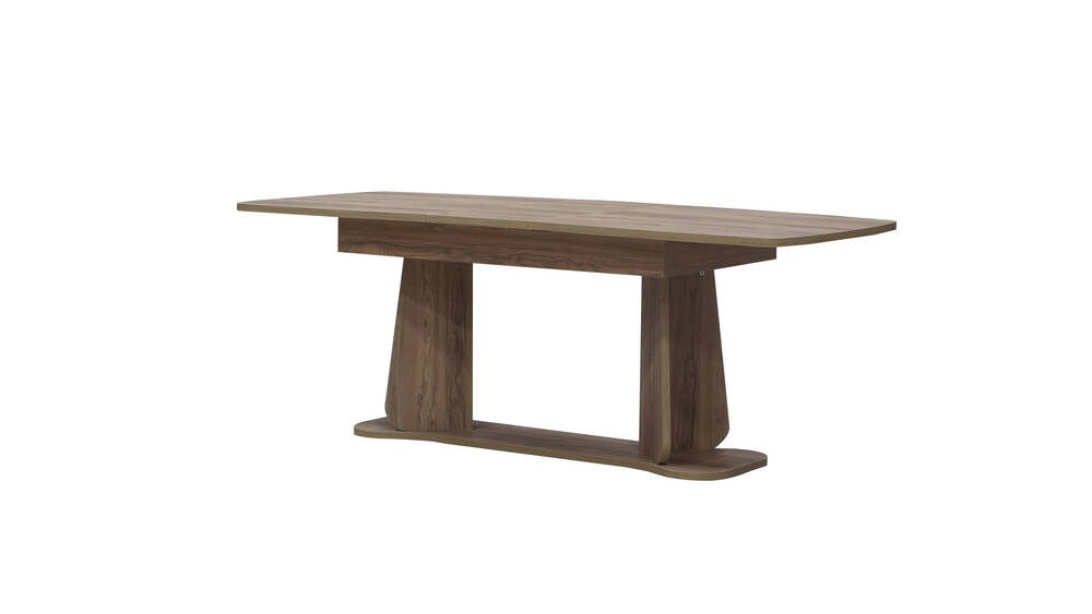 A Mesa de Jantar TUNA destaca-se pelo tampo retangular em castanho-escuro, que reforça a elegância e o caráter moderno da peça. A estrutura assenta em duas pernas unidas por um elo central, garantindo estabilidade e uma presença visual sólida.