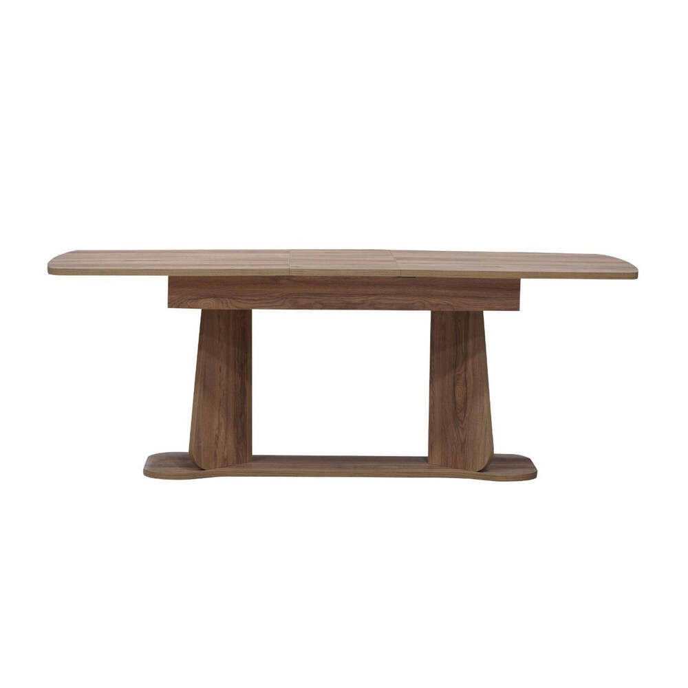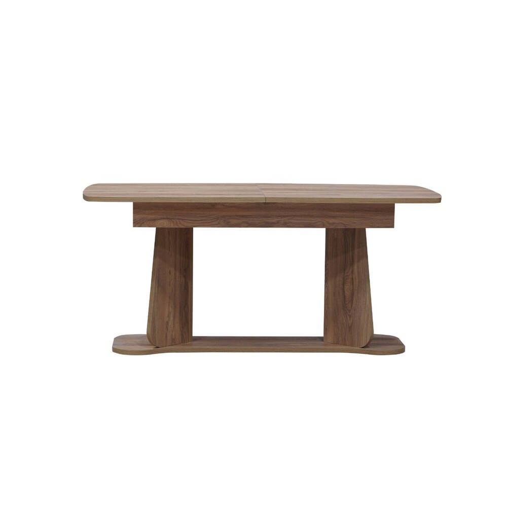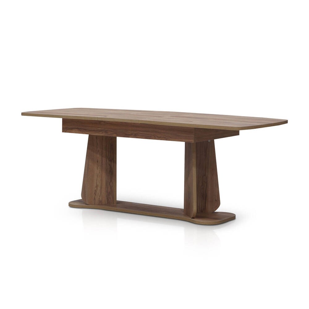 A Mesa de Jantar TUNA apresenta um tampo retangular em castanho-escuro apoiado em duas pernas ligadas por um elo central, criando um conjunto robusto, equilibrado e contemporâneo.