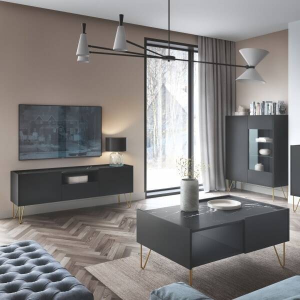 Composta por duas portas laterais, uma gaveta central e uma prateleira aberta, oferece soluções práticas para organizar equipamentos eletrónicos, acessórios ou elementos decorativos. O contraste entre os materiais e os tons cuidadosamente escolhidos reforça o seu carácter elegante, tornando-a uma peça versátil e harmoniosa na decoração da sala.