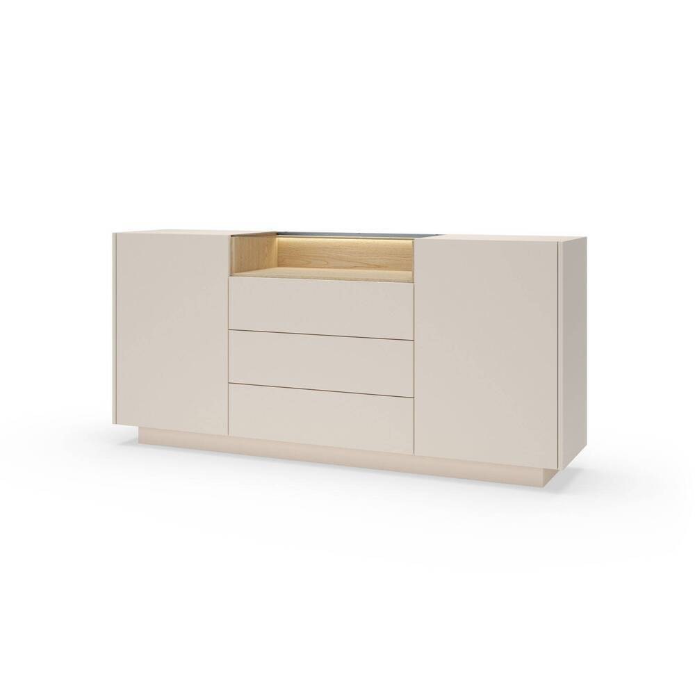 Disponível em duas versões, este aparador adapta-se a diferentes necessidades de arrumação. O nicho superior com iluminação LED acrescenta um detalhe diferenciador, ideal para expor objetos decorativos e criar um ambiente acolhedor.