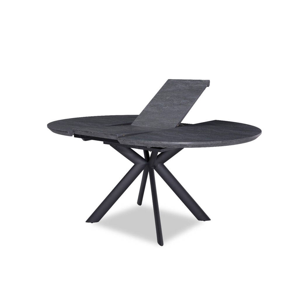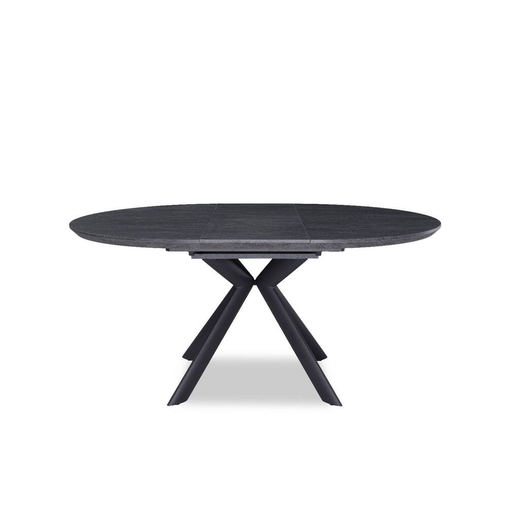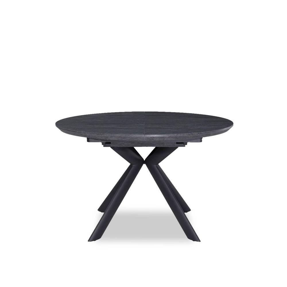 A Mesa de Jantar JC-7180 distingue-se pelo tampo oval preto, extensível, que acrescenta versatilidade e permite adaptar o espaço às necessidades do momento. A estrutura assenta em quatro pernas que se cruzam ao centro, formando uma base firme e visualmente marcante.