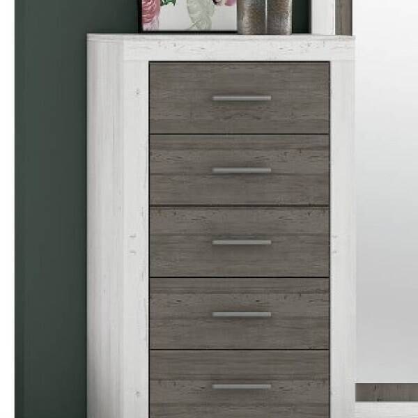 Com um perfil equilibrado e linhas direitas, a cômoda Lara oferece uma arrumação eficiente num design contemporâneo, ideal para quartos com espaço limitado. Disponibiliza cinco gavetas com puxadores discretos para facilitar o acesso, mantendo o ambiente organizado.