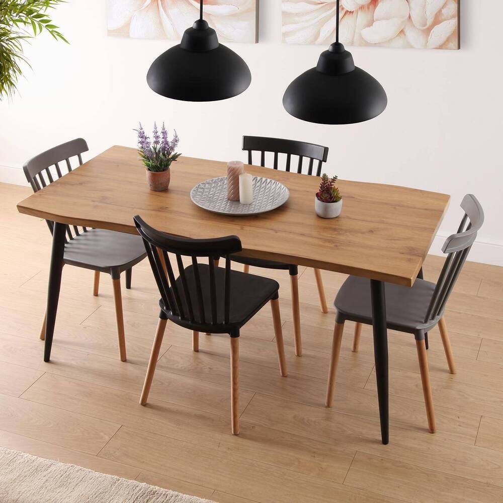 A mesa de jantar MALIKA apresenta um tampo retangular em madeira natural com bordas onduladas, que acrescentam um toque orgânico e distintivo. O tampo assenta sobre quatro pernas pretas inclinadas, criando uma base estável e visualmente leve.