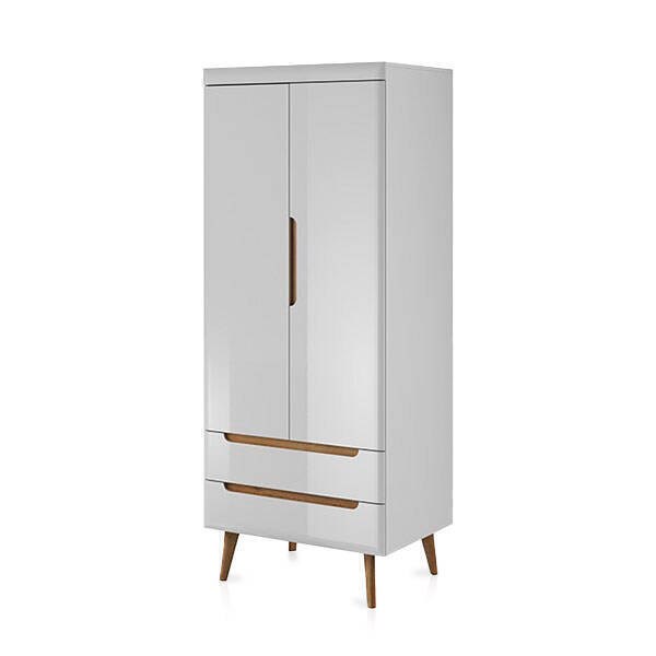 Conta com duas portas, duas gavetas exteriores e um interior versátil com espaço para pendurar roupa e prateleiras. A estrutura assenta sobre quatro pés inclinados, conferindo leveza visual e um toque contemporâneo ao conjunto.