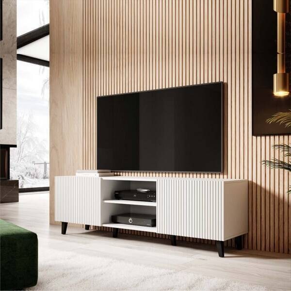 A Base de TV Pafos 150 apresenta um design moderno e funcional, ideal para otimizar o espaço da sua sala. Conta com duas portas e prateleiras interiores que proporcionam organização para os seus equipamentos e objetos. Está disponível em duas cores — branco e preto — para se adaptar a diferentes estilos de decoração.