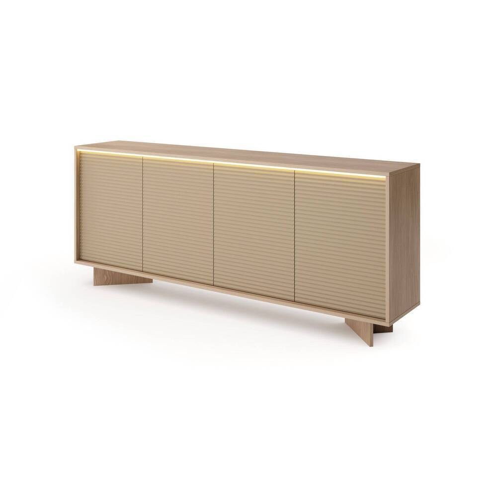 A iluminação LED integrada realça a sua presença, criando uma atmosfera acolhedora e elegante. Funcional e versátil, este aparador é a solução perfeita para quem deseja organização com um toque de distinção.