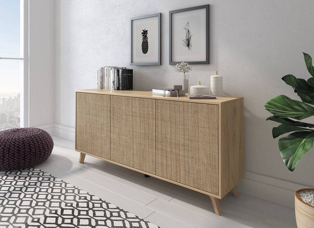 O aparador Soto combina design moderno com funcionalidade, ideal para valorizar e organizar diversos espaços. A sua estrutura em aglomerado de madeira, revestido com melamina, oferece uma superfície lisa e fácil de limpar.